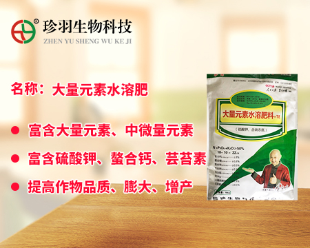 大量元素水溶肥料為經(jīng)水溶解或稀釋,用于灌溉施肥、葉面施肥、無土栽培、浸種蘸根等用途的液體或固體產(chǎn)品,可以葉面施肥、浸種蘸根、灌溉施肥,灌溉包括噴灌、滴灌等方式進行灌溉時施肥,既節(jié)約用水,又節(jié)約施肥,而且還植物吸收快,大量元素水溶肥是一種可以完全溶于水的多元復(fù)合肥料,它能迅速地溶解于水中,更容易被作物吸收,而且其吸收利用率相對較高,我們看一下珍羽生物的大量水溶肥。